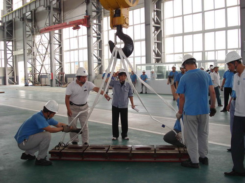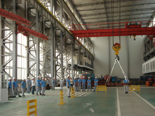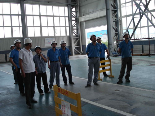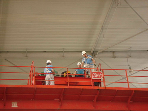 此次預(yù)演活動(dòng)的主要內(nèi)容是,吊車在運(yùn)行過(guò)程中突然停電后工作人員的應(yīng)變能力。演習(xí)開始了,首先,停電后吊車工先把開關(guān)手柄放置到“零位”并監(jiān)控總電源。同時(shí),生產(chǎn)部裝配班、物流班部分員工在各自科長(zhǎng)的帶領(lǐng)下在吊運(yùn)物件下設(shè)護(hù)欄并監(jiān)護(hù),以防有人誤進(jìn)危險(xiǎn)區(qū)域。其次,生產(chǎn)技術(shù)部維修人員按照安全操作規(guī)程,爬上吊車走臺(tái),盤車移動(dòng)到合適位置然后慢慢拉、合抱閘把物件送回地面。最后,解除危險(xiǎn)。